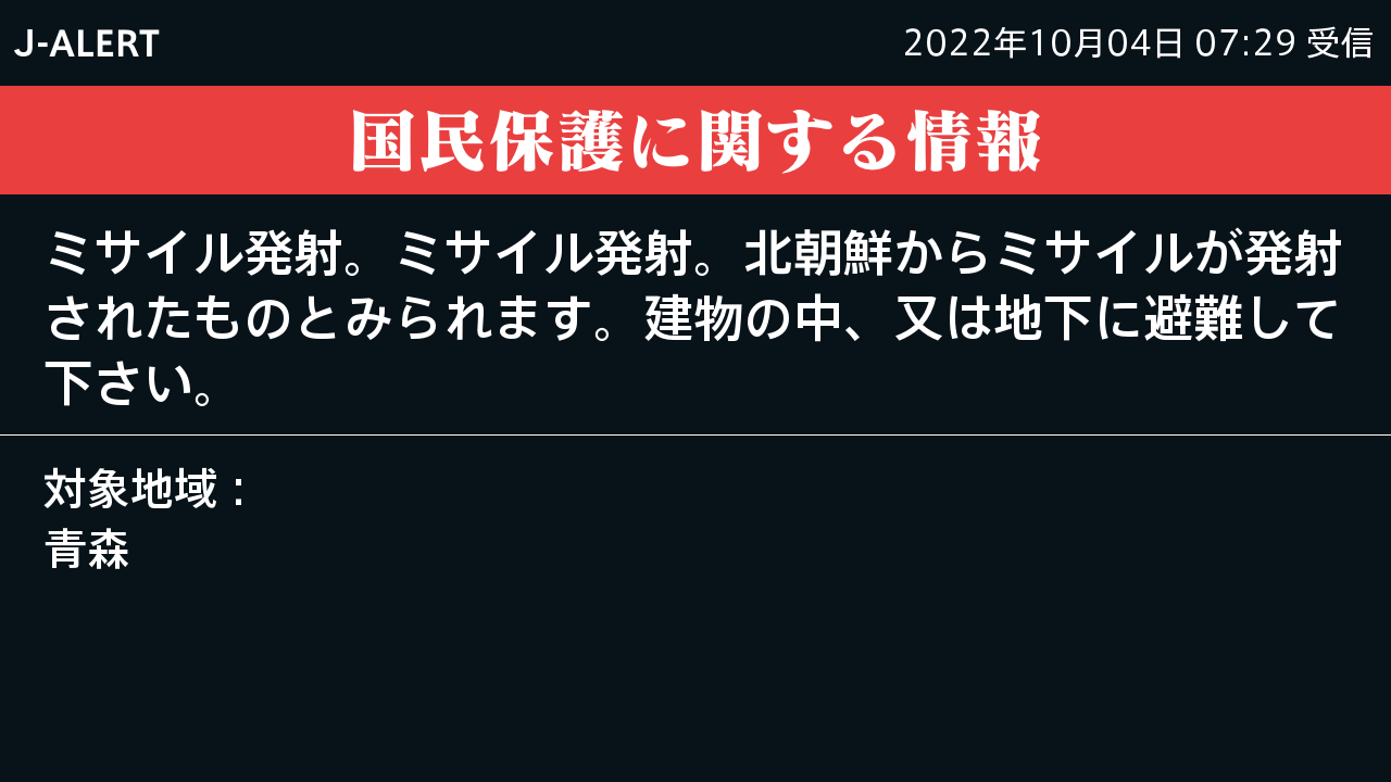 特務機関nerv On Twitter 国民保護に関する情報 J Alert ミサイル発射 ミサイル発射 北朝鮮からミサイルが発射されたものとみられます 建物の中 又は地下に避難して下さい 対象地域 青森 Https T Co Buubbak2f1 Twitter